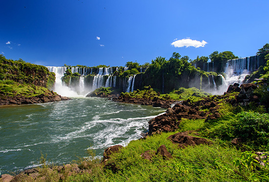 早餐后,乘機飛往伊瓜蘇,抵達后,觀 賞世界上最寬的【伊瓜蘇大瀑布國家公 園*】(不少于 120 分鐘),伊瓜蘇瀑布 分布于峽谷兩邊,阿根廷與巴西就以此 峽谷為界 ,在阿根廷和巴西觀賞到的瀑 布景色截然不同。今天前往巴西一側(cè),