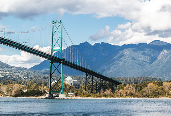 溫哥華的地標(biāo)獅門(mén)大橋橫跨在美麗的巴拉德灣Burrard Inlet上,連接著溫哥華市中心與北岸市鎮(zhèn),全長(zhǎng)1.5公里,是世界上最長(zhǎng)的懸索吊橋之一,與舊金山的金門(mén)大橋出自同一設(shè)計(jì)師之手。觀景地點(diǎn)不論是開(kāi)車(chē)從橋上經(jīng)過(guò),還是漫步于大橋兩側(cè)的人行步道,都可以飽覽橋下海灣的無(wú)限風(fēng)光,或是眺望綠樹(shù)成蔭的斯坦利公園。而要一睹大橋的全貌,則可以前往斯坦利公園,在公園的最北端,有一條曲折延伸的清幽小徑,周邊古樹(shù)參天,上至觀景臺(tái),獅門(mén)大橋便赫然矗立于眼前。近處是碧波浩淼的海灣,遠(yuǎn)處是島嶼山巒的美麗景致,令人贊嘆。