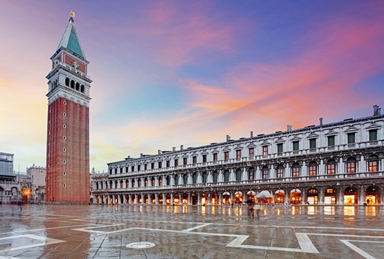 圣馬可廣場座落在威尼斯的市中心,作為威尼斯的地標,它受到游客、攝影師甚至鴿子們的青睞。圣馬可廣場在歷史上一直是威尼斯的政治、宗教和節(jié)慶中心,自19世紀以來就是大主教的駐地,它同時也是許多威尼斯節(jié)慶選擇的舉辦地。廣場周邊擁有眾多精美的文藝復(fù)興風(fēng)格建筑,如圣馬可大教堂、造幣廠、總督宮、嘆息橋等,登上鐘樓可以俯瞰整個廣場全景。