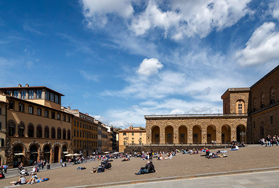 后來經(jīng)過擴建才形成了今天的規(guī)模。廣場東南角的傳統(tǒng)的行政中心老宮(Palazzo Vecchio)雄視整個廣場。老宮的左側(cè)是美麗的晚期哥特式風格的瑯琪敞廊。敞廊由本齊·迪喬內(nèi)和西莫內(nèi)·托冷蒂于1376—1382年建造。里面陳列著一組重要的雕塑作品。其中較著名的有切利尼的《帕爾修斯》(1554年)和章博洛尼亞的《??肆λ古c半人馬》。建筑的右邊是巴托洛米奧·阿曼納蒂和他的助手們作的《海神噴泉》(1563—1575年)。水池正中海馬拉的雙輪戰(zhàn)車上立著巨大的白色海神像,佛羅倫薩人稱它為“大白雕”(bian-cone,一種猛禽)。水池四周還有多姿多彩的青銅雕像。噴泉的北邊豎立著章博洛尼亞作的科西摩一世騎馬像(1594年)。廣場四周是造型樸素的歷史建筑。