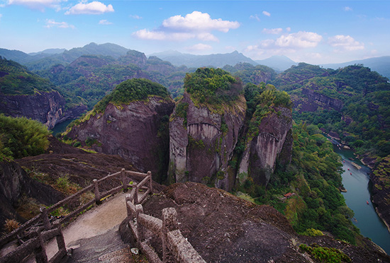 一線天又稱一字天,位于武夷山群峰南端、二曲溪南面的一個(gè)幽邃的峽谷里。該處有一座巨巖,名字叫做甫靈巖。巖傾斜而出,覆蓋三個(gè)毗鄰的山洞。探身洞中,仰觀崖頂裂隙,可見天光一線奇景,此即“一線天”。在一線天的天崖縫中,時(shí)常有罕見的哺乳動(dòng)物白蝙蝠,洞邊有竹中奇珍四方竹。右邊是伏羲洞,中間為風(fēng)洞,左為靈巖洞。
